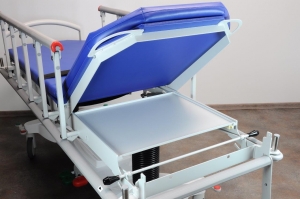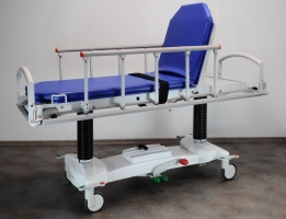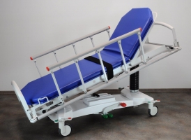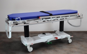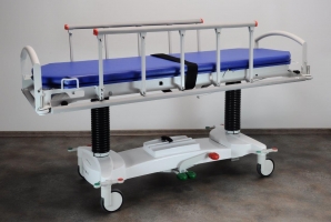 Стандартное оснащение: бамперные профиль по периферии рамы, бамперные колеса по углам; ограничивающие поручни, чтобы предотвратить падение пациента; рабочие ручки в передних частях; съемный держатель для инфузий, держатель кислородного баллона, фиксирующий ремень.