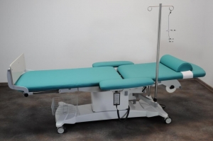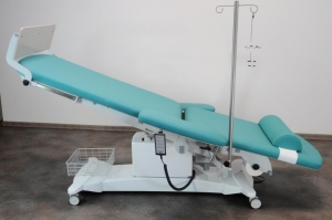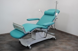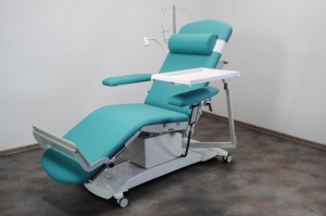 Кресло является оптимальным решением для длительного пребывания пациента во время трансфузии или диализа. Комфортное кресло для любого положения пациента. Мобильная версия с тормозными колесами Ø 75 mm. Современный дизайн с мягкой обивкой и белыми пластиковыми накладками, моются. Рабочая поверхность разделена на 3 сегмента и имеет общие размеры 640 × 2200 мм покрыты искусственной кожей в цвете по вашему выбору. Рабочая поверхность делится на спинку, сиденье и ноги. Комфорт пациента также обеспечит подголовник, положение которого можно настроить для пациента. Искусственную кожу, сертифицирована для использования в сфере здравоохранения, можно мыть и обеззараживать.