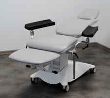 Комфортное кресло для взятия проб во время сидения, в полулежачем и в лежачем положении. Современный дизайн с удобной обивкой и серым пластиковым корпусом. Мобильная версия с тормозными колесами диаметром 75 мм. Четырехсекционная рабочая поверхность шириной 480 мм покрыта искусственной кожей в цвете на Ваш выбор; делится на сегмент головы, спинки, сиденья и сегмент ног. Сегмент головы можно регулировать вручную; сегмент ног можно вручную наклонить для положения лежа.
