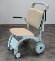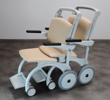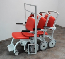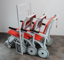 Конструкция складывающегося стула, эффективно решает перемещения людей с особыми потребностями не только в больницах, но и в аэропортах, стадионах, торговых центрах и культурных объектах. Благодаря уникальному дизайну каждая дополнительная тележка при составлении "один в один" занимает лишь 38% предыдущего. Тележку можно оборудовать монетным механизмом для отсоединения друг от друга. Это обеспечивает процесс возвращения тележек обратно в стойку. На стойке предусмотрено информационную табличку. Комфортное мягкое сиденье с небольшим наклоном назад, спинка эргономичной формы, размера и высоты для максимального комфорта пациента и удобного использования. Несмотря на компактность тележки, он устойчив, человек которого перевозят чувствует себя комфортно.